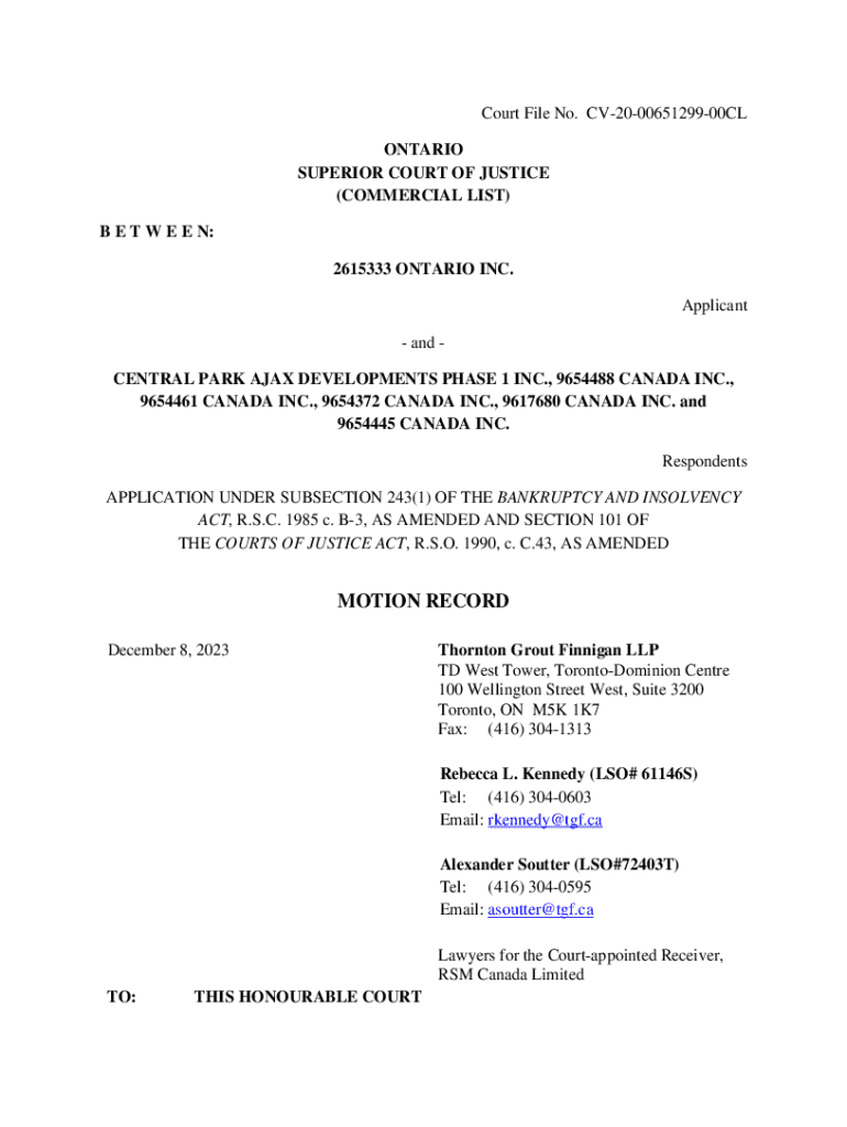 Court File No. CV200065129900CL ONTARIO SUPERIOR COURT OF JUSTICE (COMMERCIAL LIST) B E T W E E N: 2615333 ONTARIO INC. Applicant and CENTRAL PARK AJAX DEVELOPMENTS PHASE 1 INC., 9654488 CANADA INC.,