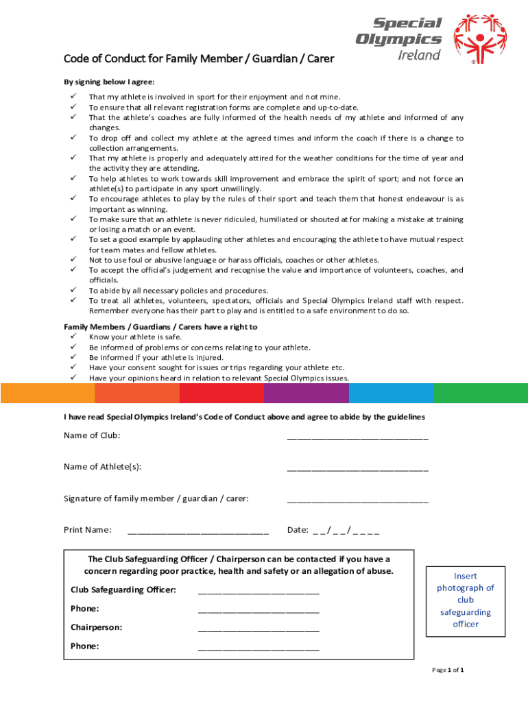 Code of Conduct for Family Member / Guardian / Carer By signing below I agree: That my athlete is involved in sport for their enjoyment and not mine. To ensure that all relevant registration forms