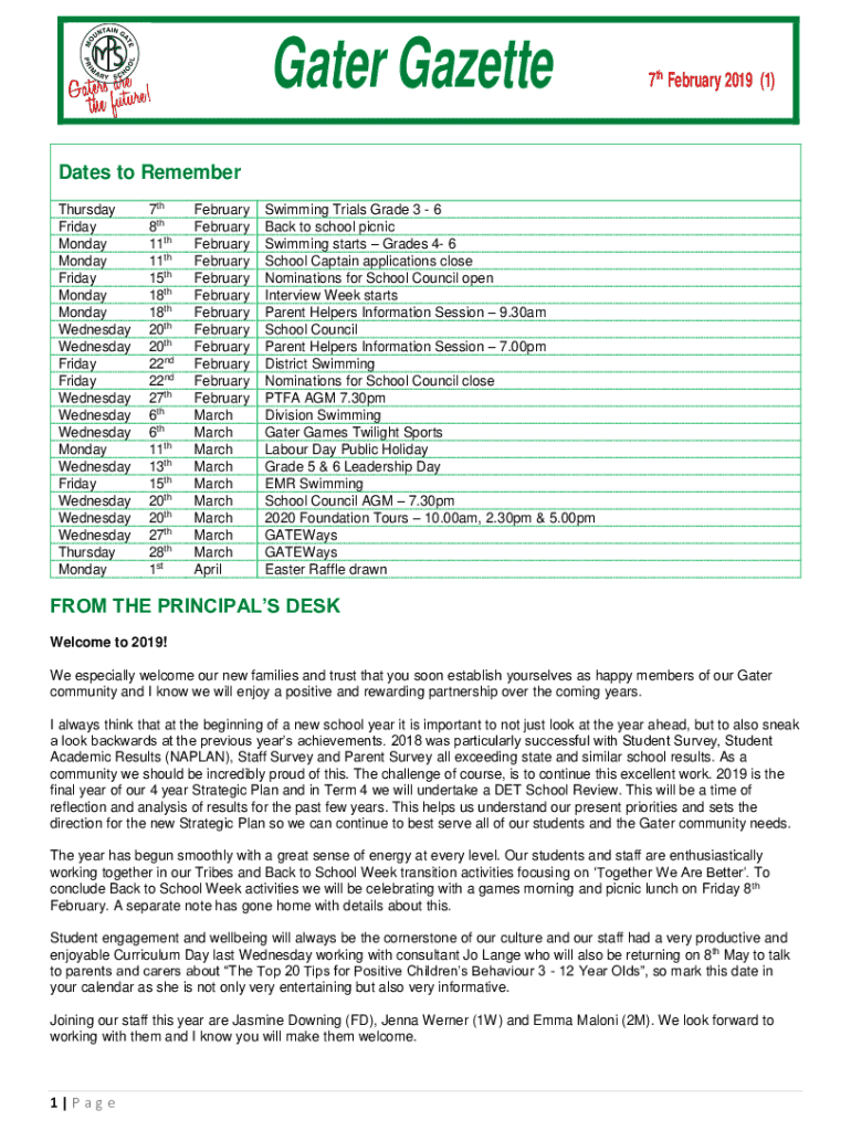 Stay updated with the latest events and important dates at Mountain Gate Primary School in February 2019. Involve in the Later community and support your children!