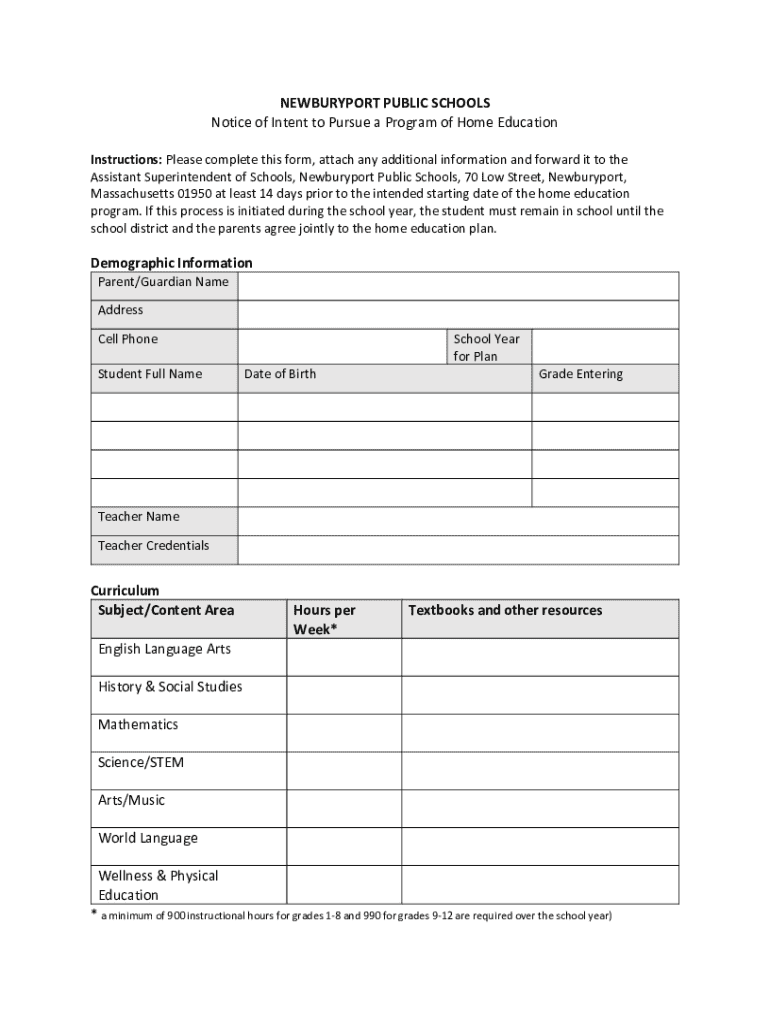 Complete the Newburyport Public Schools Home Education form to initiate your home education program. Submit it 14 days before starting. Ensure compliance with Massachusetts laws.
