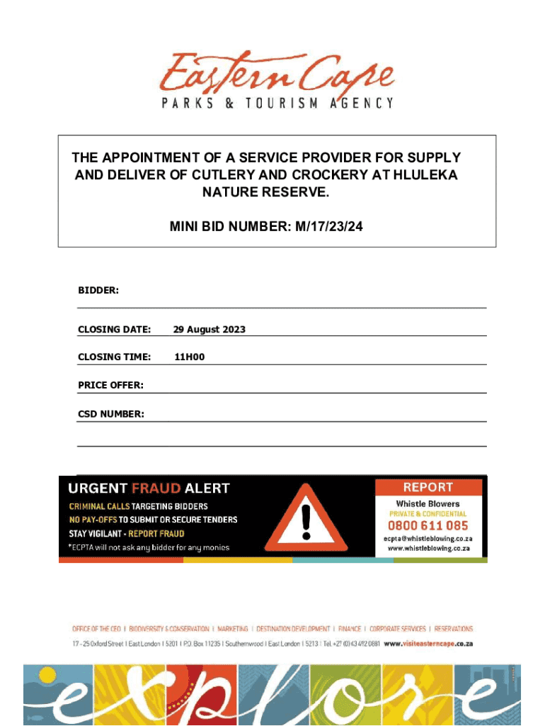 THE APPOINTMENT OF A SERVICE PROVIDER FOR SUPPLY AND DELIVER OF CUTLERY AND CROCKERY AT LULEÅ NATURE RESERVE. MINI BID NUMBER: M/17/23/24BIDDER:CLOSING DATE:29 August 2023CLOSING TIME:11H00PRICE
