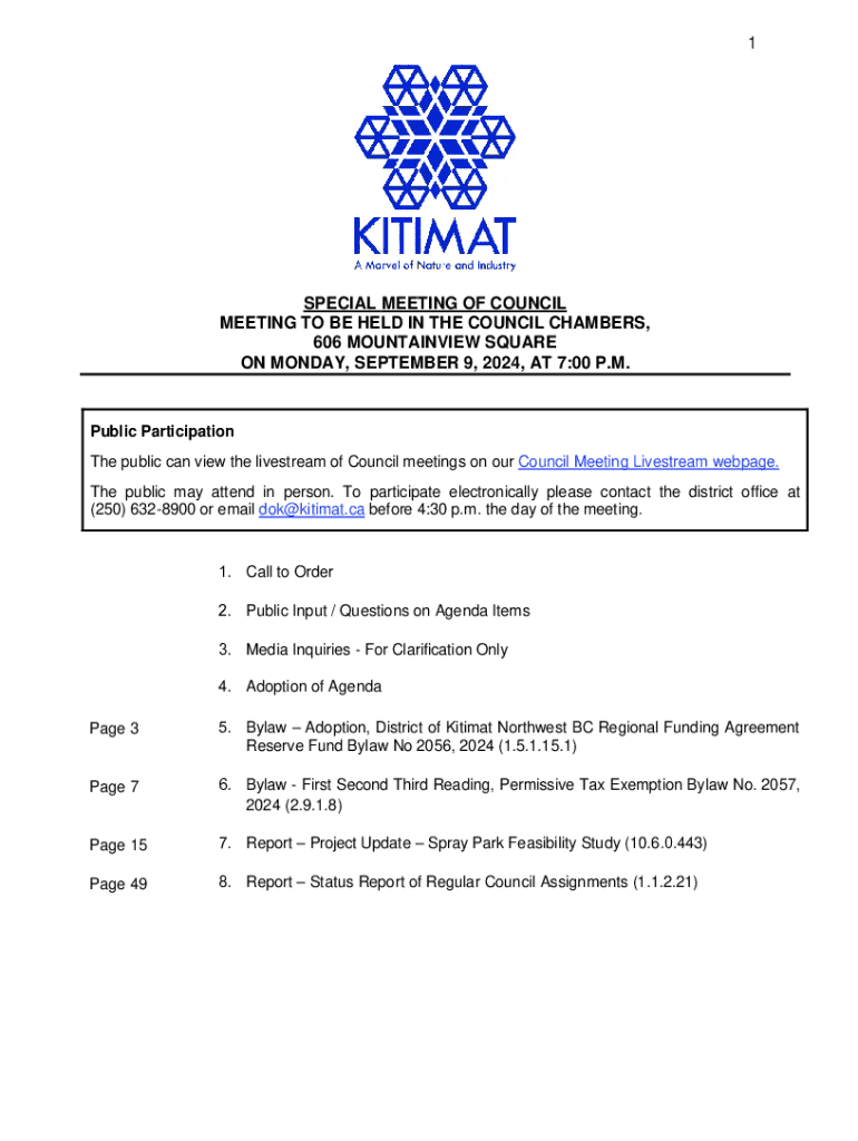 1SPECIAL MEETING OF COUNCIL MEETING TO BE HELD IN THE COUNCIL CHAMBERS, 606 MOUNTAINVIEW SQUARE ON MONDAY, SEPTEMBER 9, 2024, AT 7:00 P.M.Public Participation The public can view the livestream of