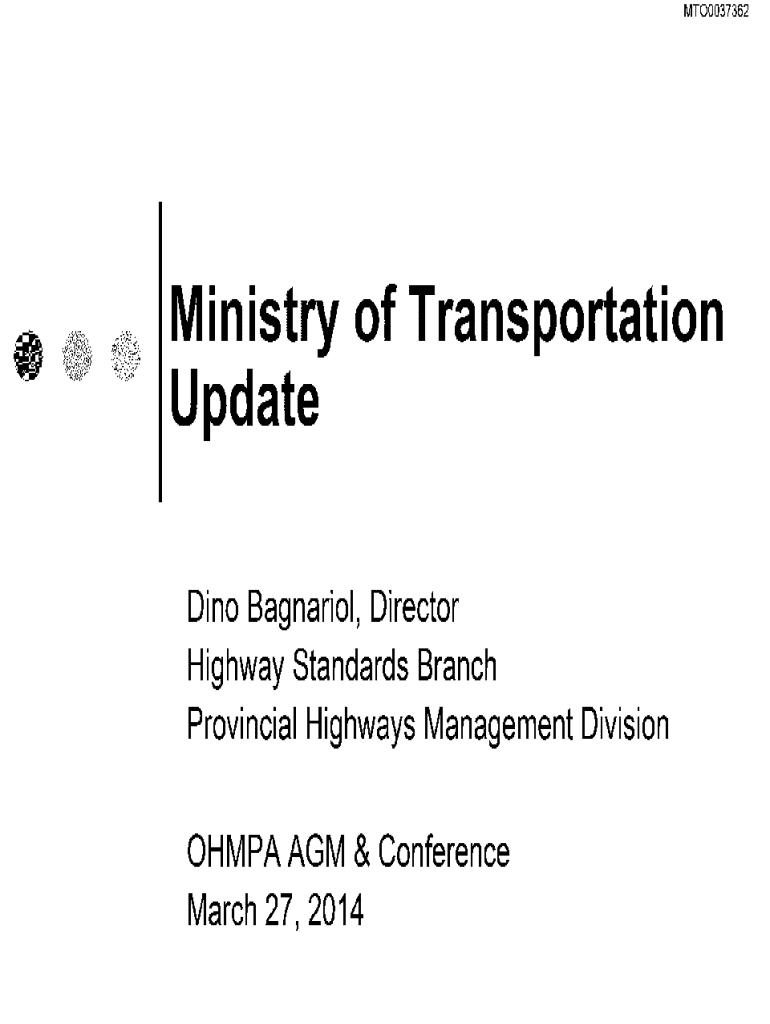 MT00037362Ministry of Transportation Update Dino Ragnarok, Director Highway Standards Branch Provincial Highways Management Division OH MPA AGM & Conference March 27, 2014MT00037362Overview PM 20132015