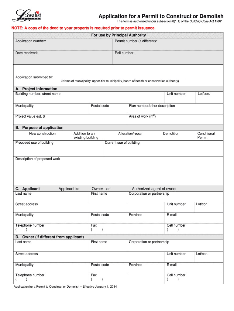 Application for a Permit to Construct or Demolish This form is authorized under subsection 8(1.1) of the Building Code Act,1992 NOTE: A copy of the deed to your property is required prior to permit
