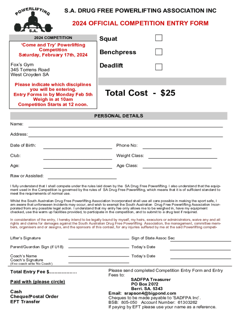 Enter the 2024 Come and Try Powerlifting Competition on February 17th. Complete your entry form before February 5th and join us at Fox\'s Gym.