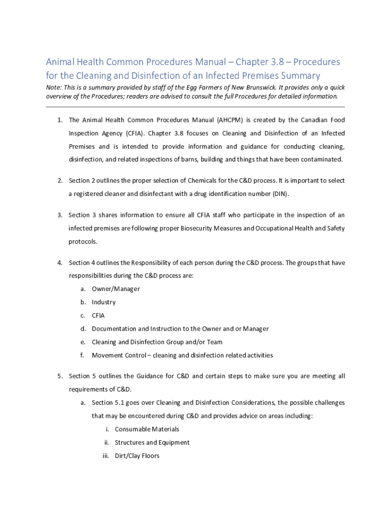 Animal Health Common Procedures Manual Chapter 3.8 Procedures for the Cleaning and Disinfection of an Infected Premises Summary Note: This is a summary provided by staff of the Egg Farmers of New