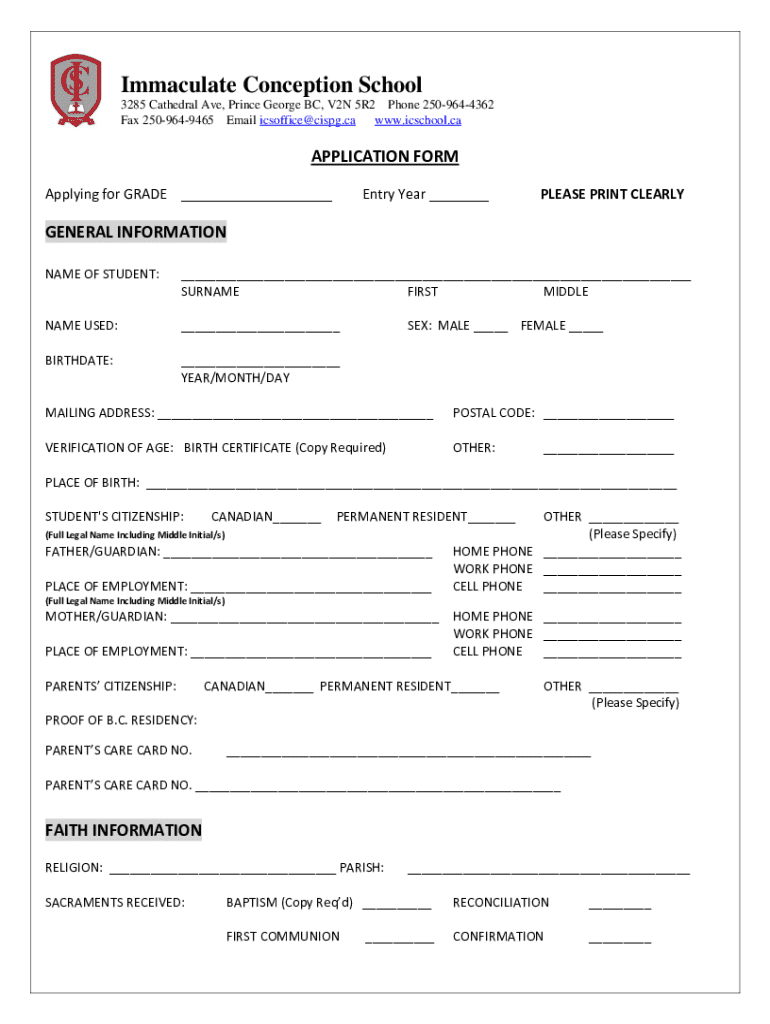 Immaculate Conception School 3285 Cathedral Ave, Prince George BC, V2N 5R2 Phone 2509644362 Fax 2509649465 Email icsoffice@cispg.ca www.icschool.caAPPLICATION FORM Applying for GRADE ___Entry Year