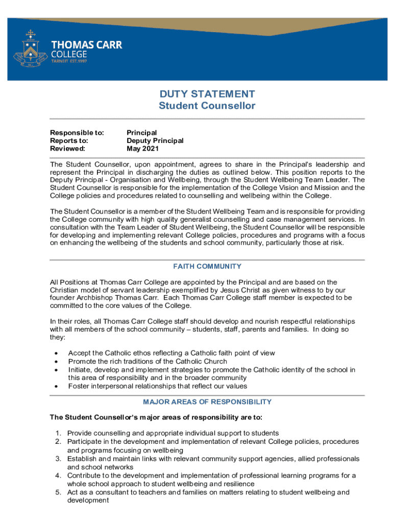 DUTY STATEMENT Student Counselor Responsible to: Reports to: Reviewed:Principal Deputy Principal May 2021The Student Counselor, upon appointment, agrees to share in the Principals leadership and represent