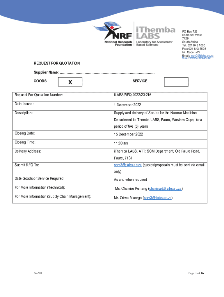 This document outlines the Request for Quotation (RFQ 2022/23:216) for supplying scrubs to iThemba LABS for five years, including conditions and documents required for bidders.