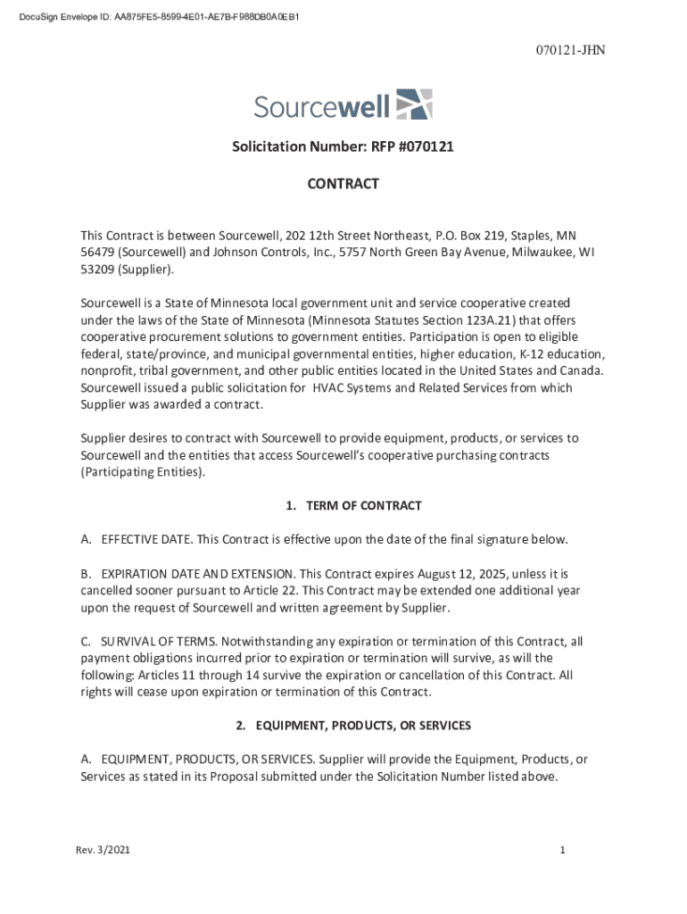 070121JHNSolicitation Number: RFP #070121 CONTRACT This Contract is between Sourcewell, 202 12th Street Northeast, P.O. Box 219, Staples, MN 56479 (Sourcewell) and Johnson Controls, Inc., 5757 North