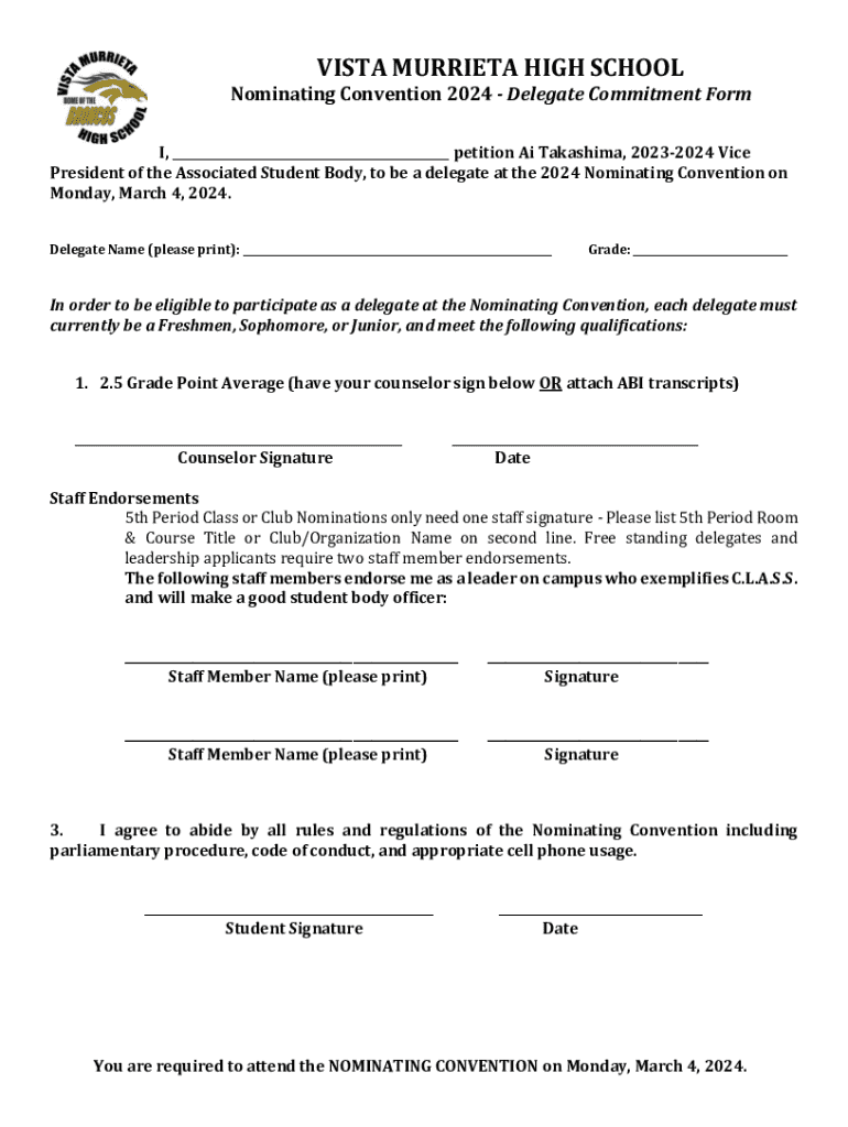 VISTA MURRIETA HIGH SCHOOL Nominating Convention 2024 Delegate Commitment Form I, ___ petition Ai Takashi, 20232024 Vice President of the Associated Student Body, to be a delegate at the 2024 Nominating