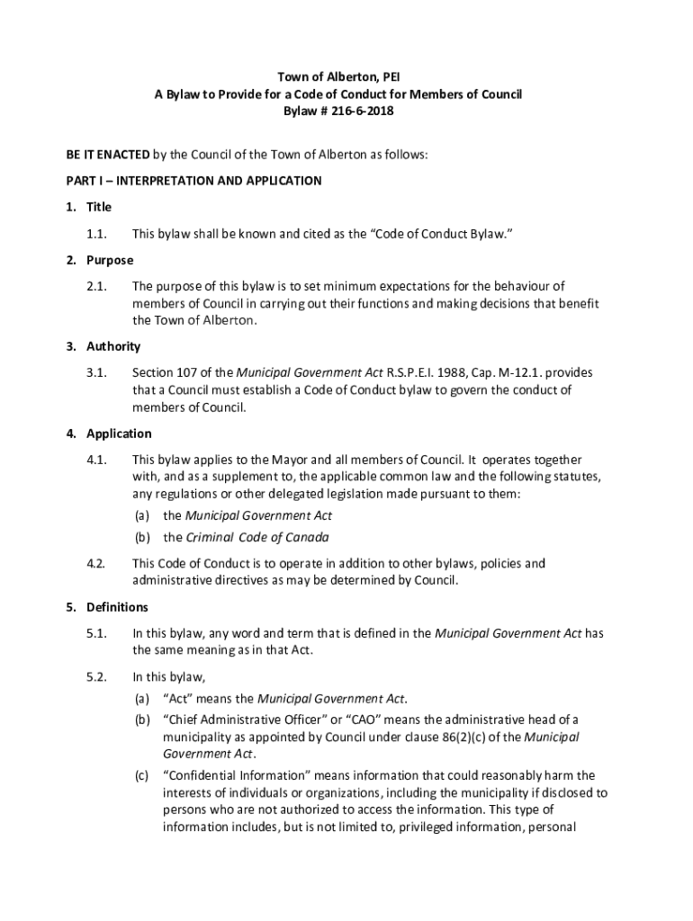 Town of Alberto, PEI A Bylaw to Provide for a Code of Conduct for Members of Council Bylaw # 21662018 BE IT ENACTED by the Council of the Town of Alberto as follows: PART I INTERPRETATION AND APPLICATION