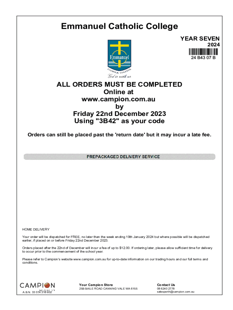 Emmanuel Catholic College YEAR SEVEN 2024ALL ORDERS MUST BE COMPLETED Online at www.campion.com.au by Friday 22nd December 2023 Using \"3B42\" as your code Orders can still be placed past the \'return