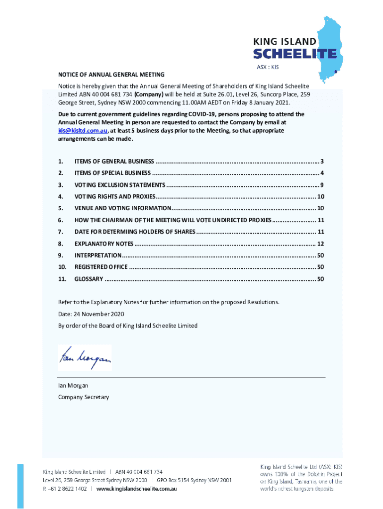 NOTICE OF ANNUAL GENERAL MEETING Notice is hereby given that the Annual General Meeting of Shareholders of King Island Satellite Limited ABN 40 004 681 734 (Company) will be held at Suite 26.01, Level