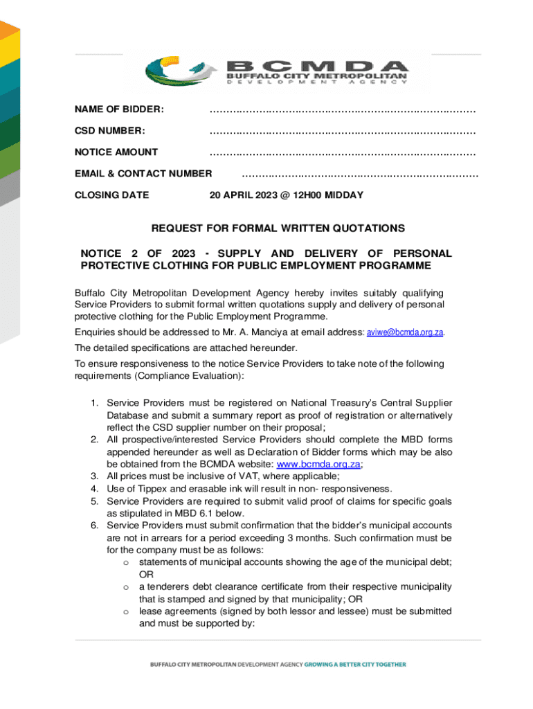 NAME OF BIDDER:CSD NUMBER:NOTICE AMOUNTEMAIL & CONTACT NUMBER CLOSING DATE20 APRIL 2023 @ 12H00 MIDDAYREQUEST FOR FORMAL WRITTEN QUOTATIONS NOTICE 2 OF 2023 SUPPLY AND