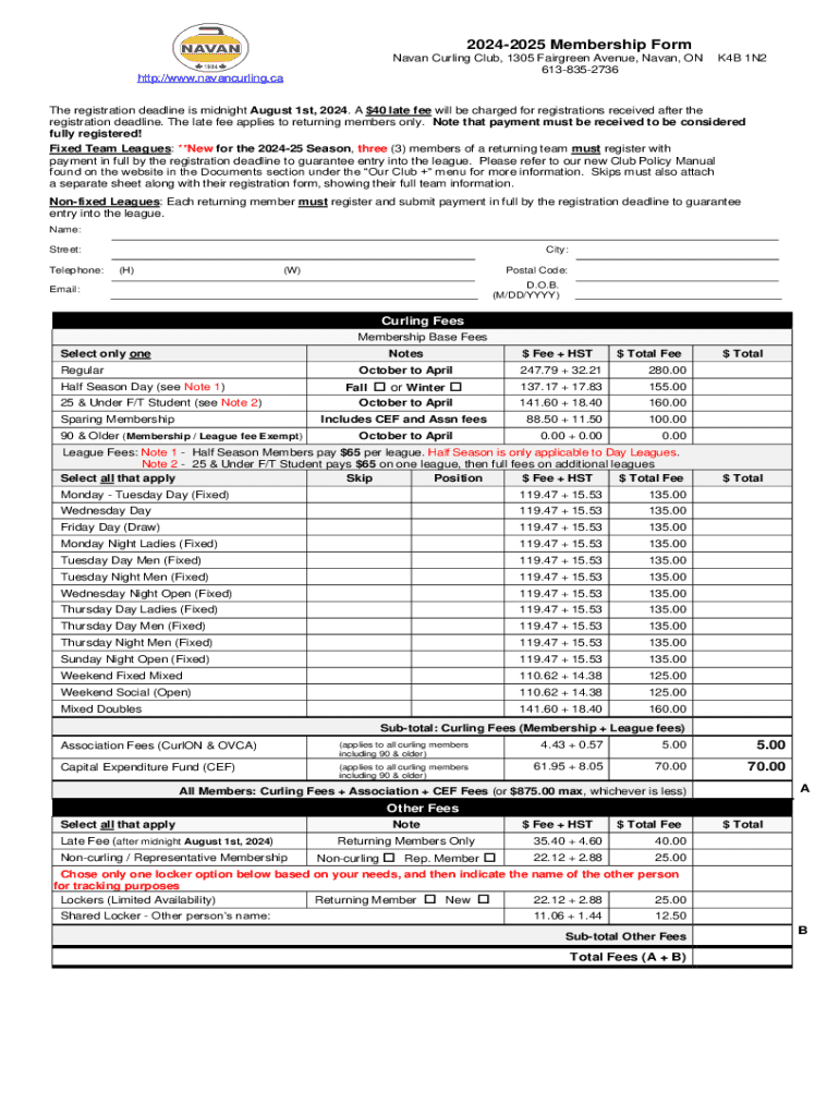 20242025 Membership Form Navan Curling Club, 1305 Fairgreen Avenue, Navan, ON 6138352736http://www.navancurling.caK4B 1N2The registration deadline is midnight August 1st, 2024. A $40 late fee will