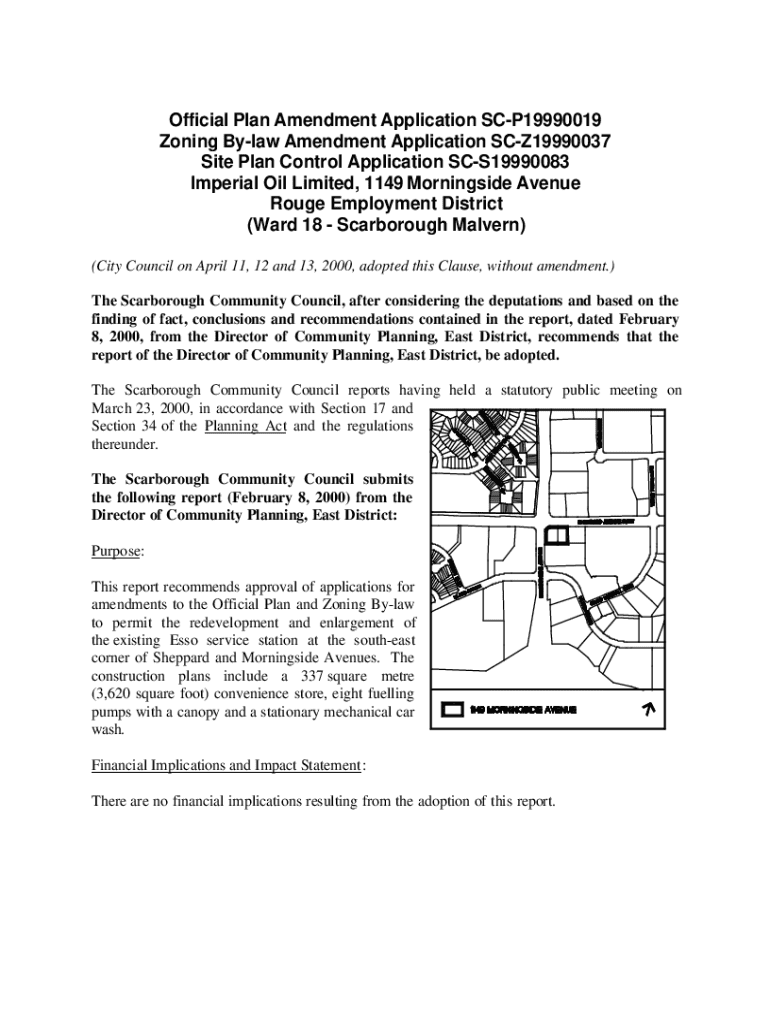 Official Plan Amendment Application SCP19990019 Zoning Bylaw Amendment Application SCZ19990037 Site Plan Control Application SCS19990083 Imperial Oil Limited, 1149 Morningside Avenue Rouge Employment