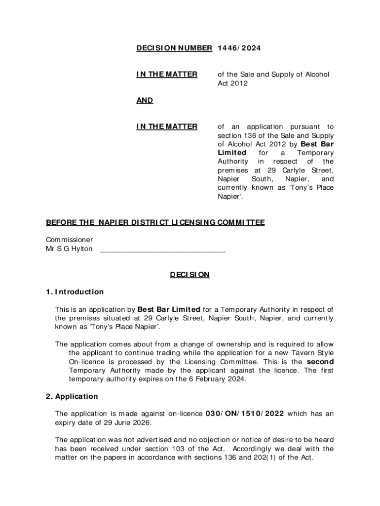 DECISION NUMBER 1446/2024 IN THE MATTER of the Sale and Supply of Alcohol Act 2012AND IN THE MATTER of an application pursuant to section 136 of the Sale and Supply of Alcohol Act 2012 by Best Bar