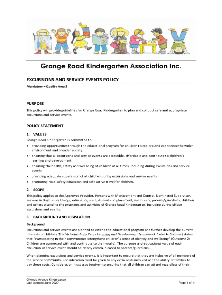 Grange Road Kindergarten Association Inc. EXCURSIONS AND SERVICE EVENTS POLICY Mandatory Quality Area 2PURPOSE This policy will provide guidelines for Grange Road Kindergarten to plan and conduct