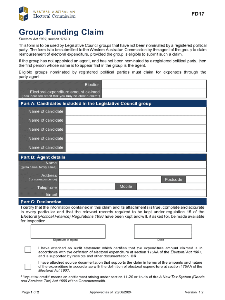 Submit this form for reimbursement of electoral expenditure for Legislative Council groups not nominated by a registered political party in 2024.