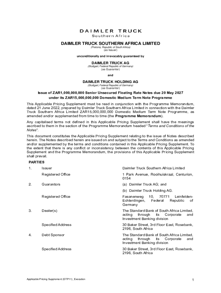 DAIMLER TRUCK SOUTHERN AFRICA LIMITED (Pretoria, Republic of South Africa)(as Issuer)unconditionally and irrevocably guaranteed Daimler TRUCK AG (Stuttgart, Federal Republic of Germany)(as Guarantor)Daimler