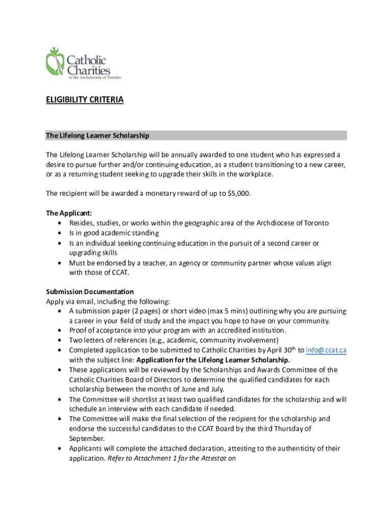 ELIGIBILITY Criteria Lifelong Learner Scholarship The Lifelong Learner Scholarship will be annually awarded to one student who has expressed a desire to pursue further and/or continuing education,