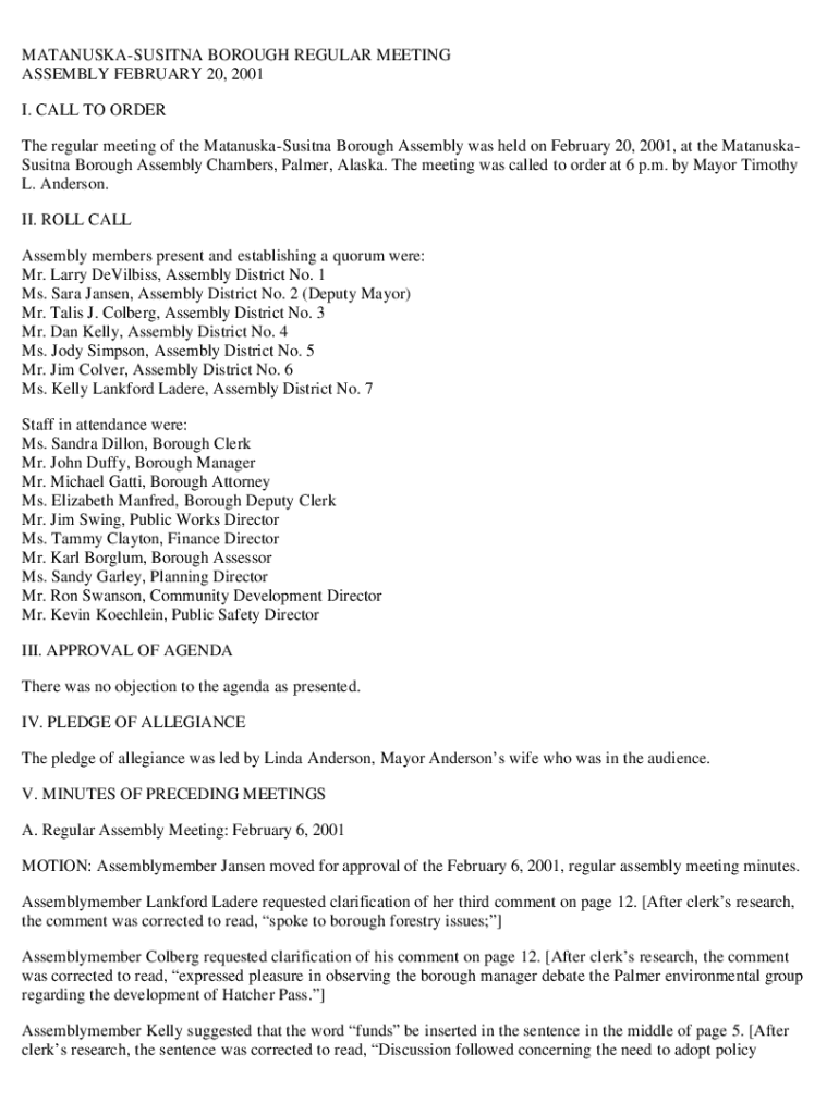 The regular meeting of the MatanuskaSusitna Borough Assembly was held on February 20, 2001, at the MatanuskaSusitna