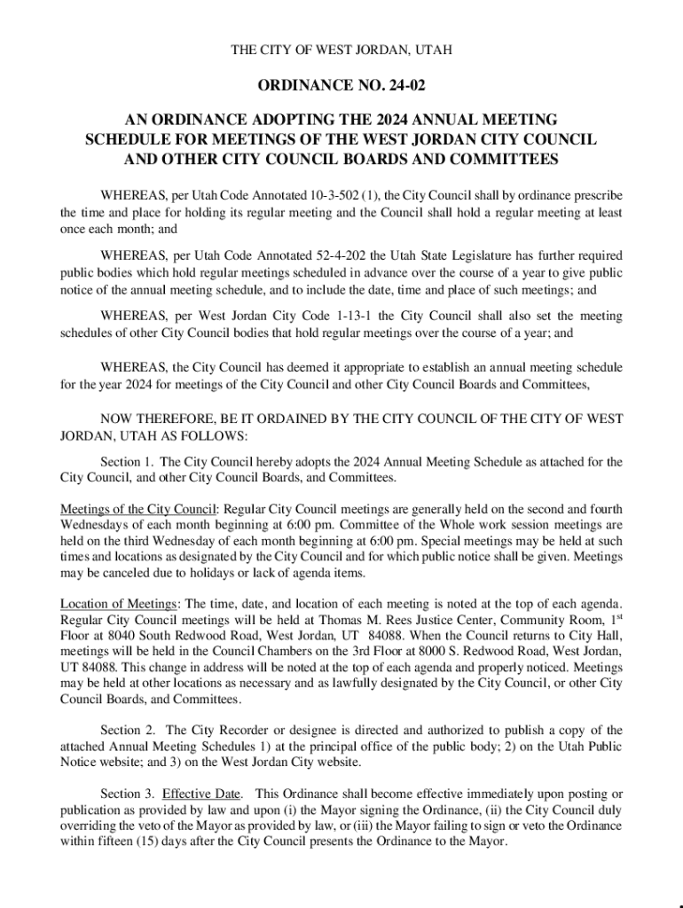 This ordinance establishes the 2024 annual meeting schedule for the West Jordan City Council and its committees, ensuring public notice and compliance with Utah law.