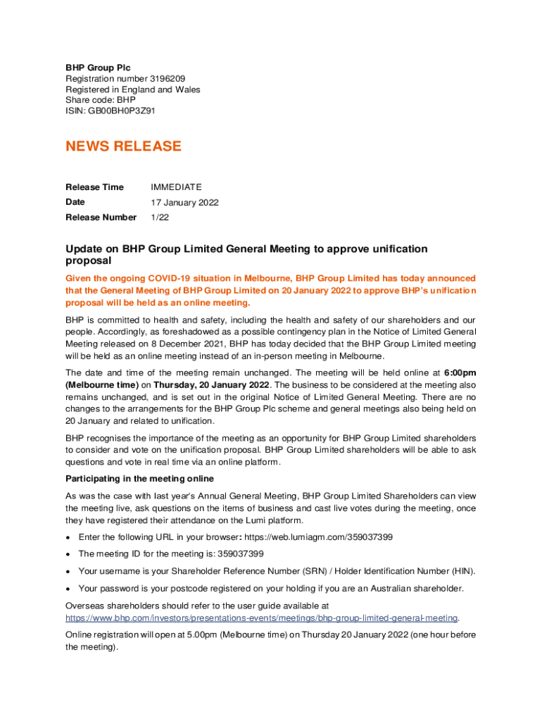 BHP Group Plc Registration number 3196209 Registered in England and Wales Share code: BHP ISIN: GB00BH0P3Z91NEWS RELEASE Release TimeIMMEDIATEDate17 January 2022Release Number1/22Update on BHP Group