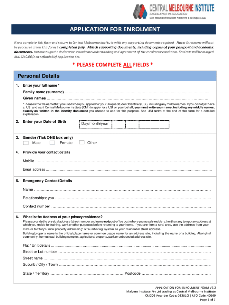 Get the free Note: Enrolment will not - cmi vic edu