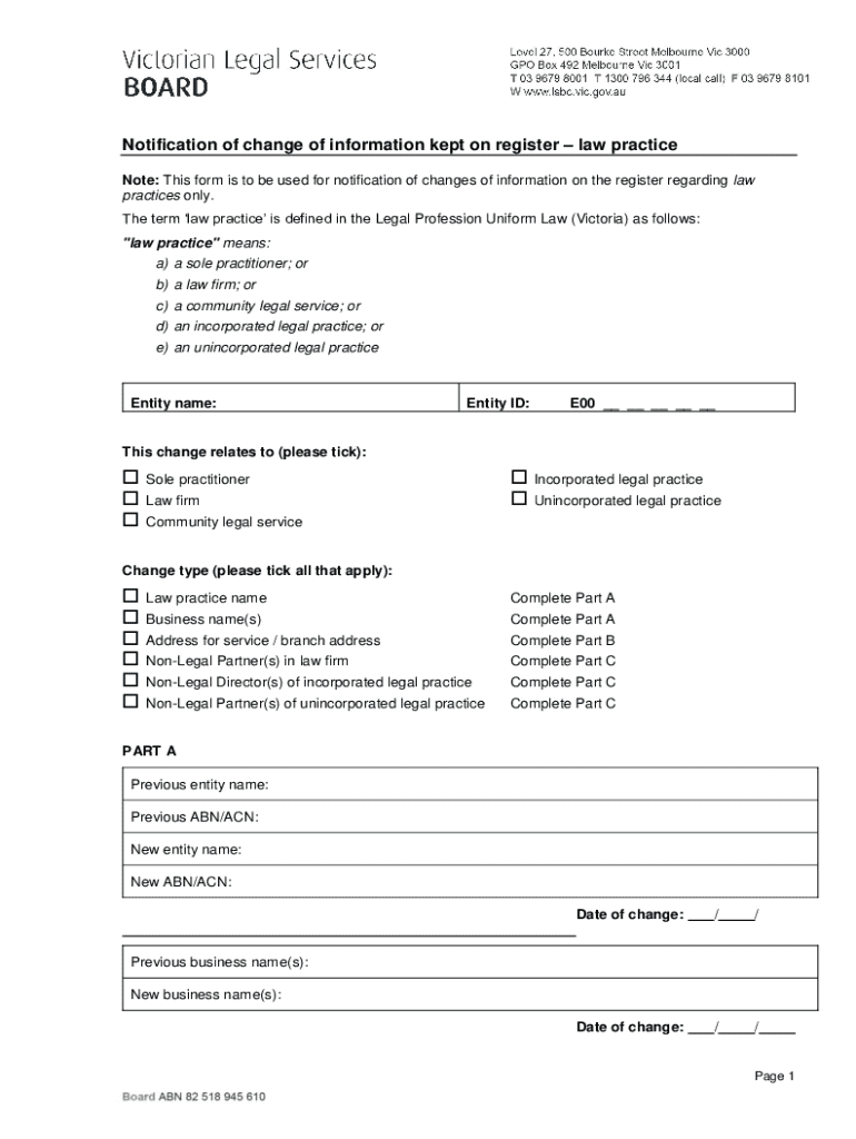 This form is used to notify changes in information on the register for law practices, including name and address changes. Ensure accurate details are provided.