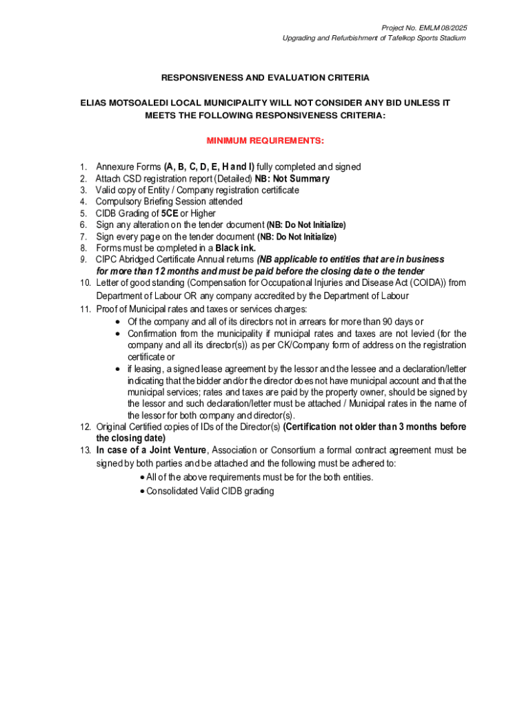 Project No. ELM 08/2025 Upgrading and Refurbishment of Tabletop Sports StadiumRESPONSIVENESS AND EVALUATION CRITERIA ELIAS MOTSOALEDI LOCAL MUNICIPALITY WILL NOT CONSIDER ANY BID UNLESS IT MEETS THE