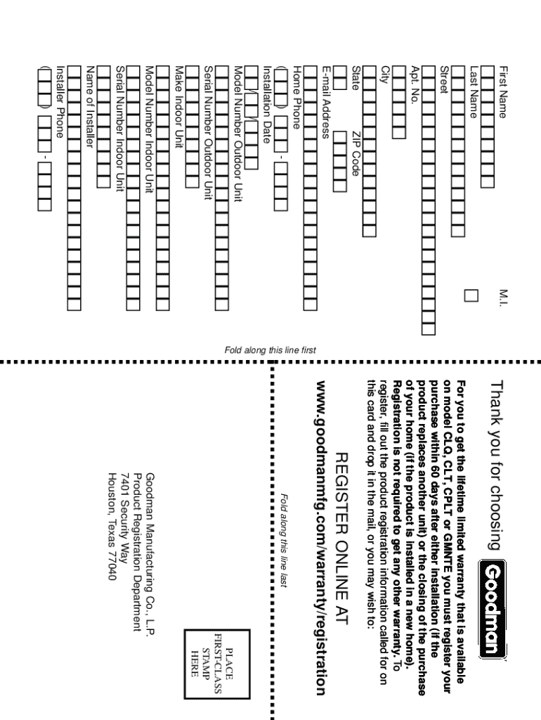 Register your Goodman product within 60 days for a lifetime limited warranty. Complete the form and mail it or register online for convenience.