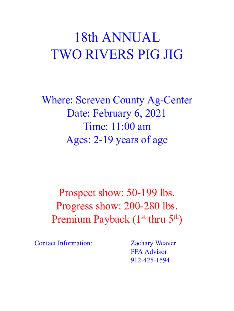 Join us for the 2021 Two Rivers Pig Jig at Screven County Ag-Center on February 6. Register now for showmanship and enjoy exciting livestock competition!