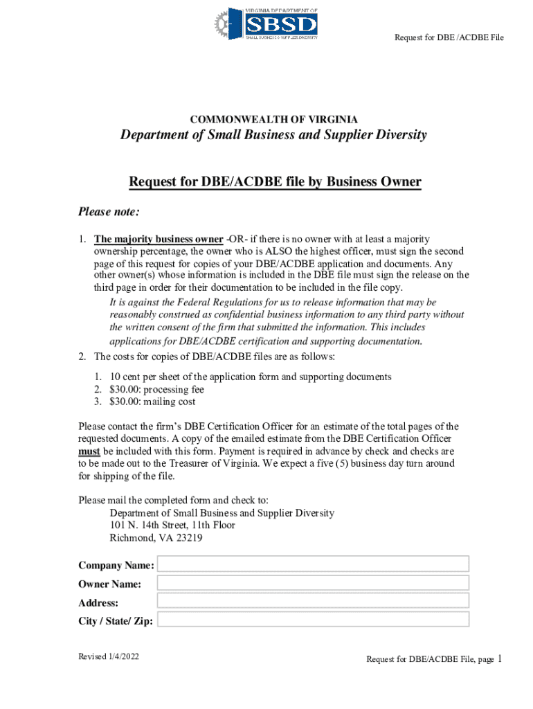 Request for BE /ACRE FileCOMMONWEALTH OF VIRGINIADepartment of Small Business and Supplier Diversity