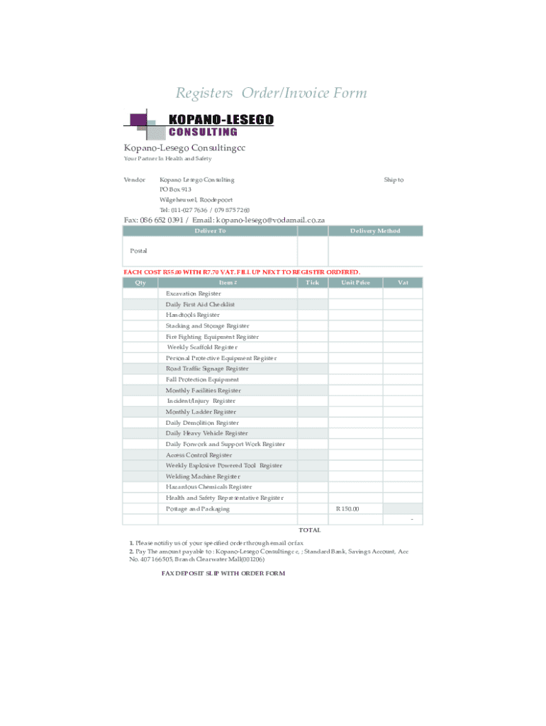 Registers Order/Invoice FormKopanoLesego Consulting cc