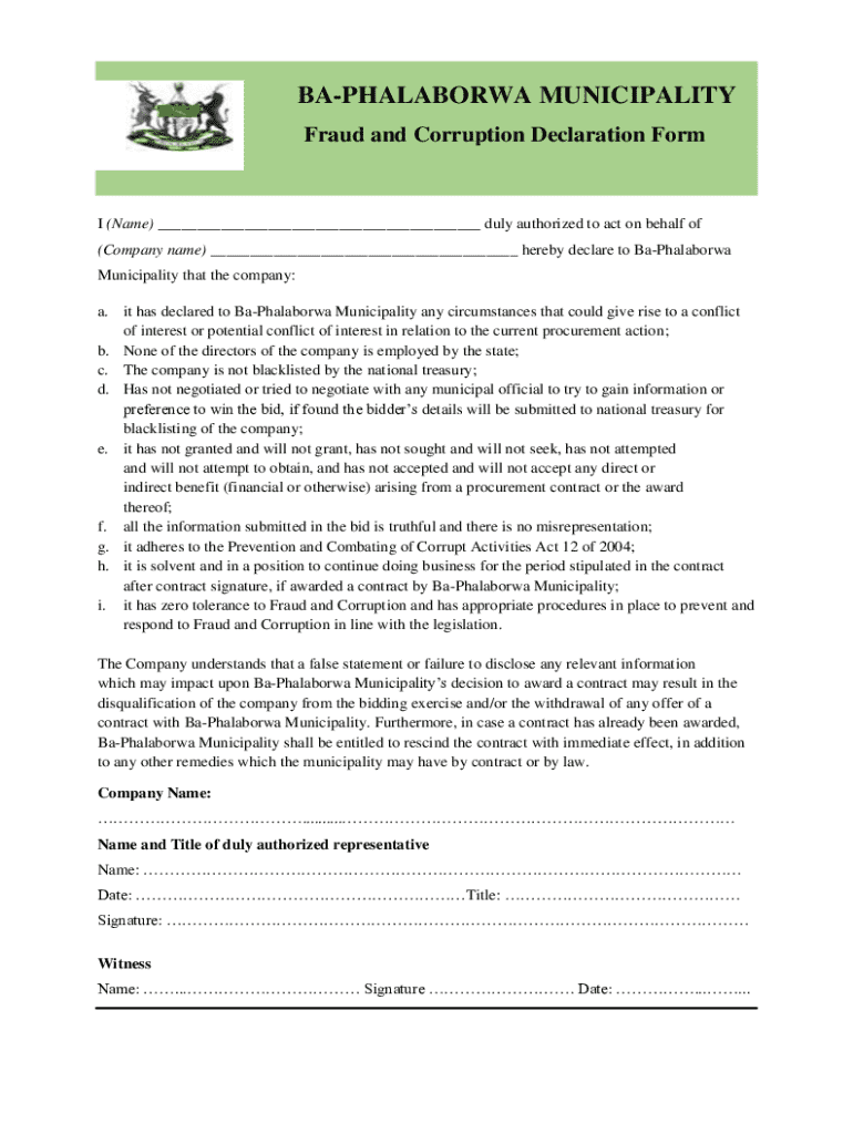 Fraud and Corruption Declaration Form (Name) ___ duly authorized to act on behalf of
