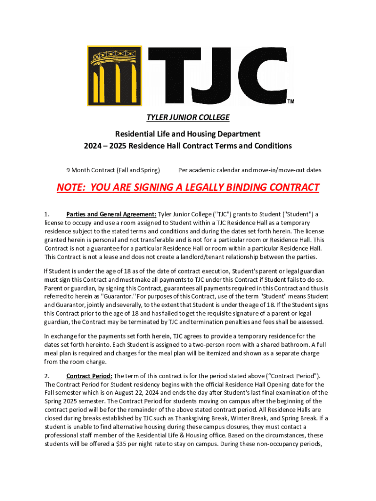 TYLER JUNIOR COLLEGE Residential Life and Housing Department 2024 2025 Residence Hall Contract Terms and Conditions 9-Month Contract (Fall and Spring)Per academic calendar and Moran/move out denote: