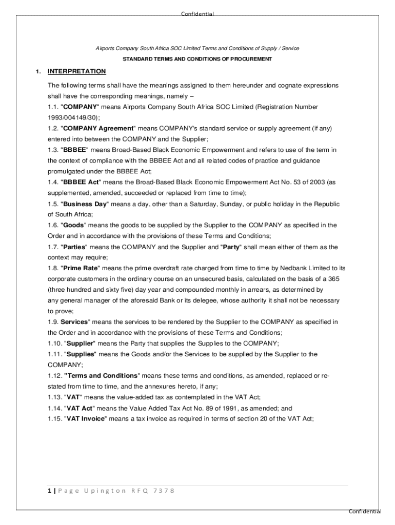 Explore the comprehensive terms and conditions set by Airports Company South Africa for procurement, covering BB BEE compliance, delivery obligations, and payment terms.