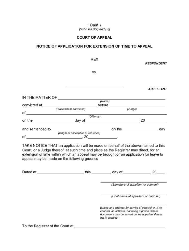 FORM 7[Subrules 3(2) and (3)]COURT OF APPEAL NOTICE OF APPLICATION FOR EXTENSION OF TIME TO APPEAL REXRESPONDENTvs. ___APPELLANTIN THE MATTER OF ___ (Name)convicted at ___ before ___ (Place where