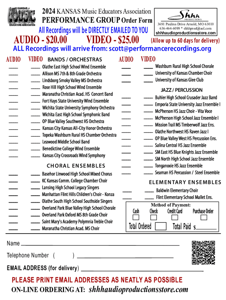KANSASEDUCATORS ASSOCIATIONS2024 KANSAS Music Educators Association PERFORMANCE GROUP Order FormVIDEO $25.00PRODUCTIONS3691 Paulina Drive Arnold, MO 63010 6364646099 * shhhprod@aol.comAUDIO $20.00hhhshhhaudioproductionsstore.com