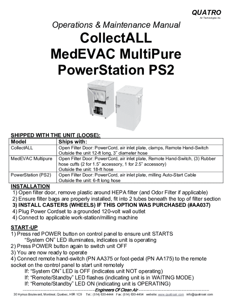 Comprehensive operations and maintenance manual for CollectALL MedEVAC MultiPure PowerStation PS2, detailing installation, safety, and troubleshooting procedures.