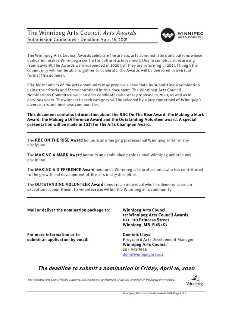 The Winnipeg Arts Council Arts Awards Submission Guidelines Deadline April 16, 2021The Winnipeg Arts Council Awards celebrate the artists, arts administrators and patrons whose dedication makes Winnipeg