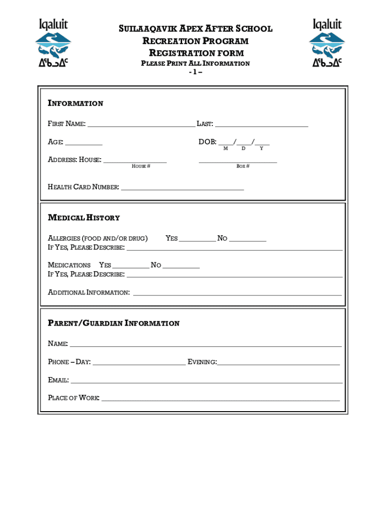 SUILAAQAVIK APEX AFTER SCHOOL RECREATION PROGRAM REGISTRATION FORM PLEASE PRINT ALL INFORMATION 1INFORMATION FIRST NAME: ___ LAST: ___ AGE: ___DOB: ___/___/___ MADDRESS: HOUSE: ___ HOUSE #DY___ BOX