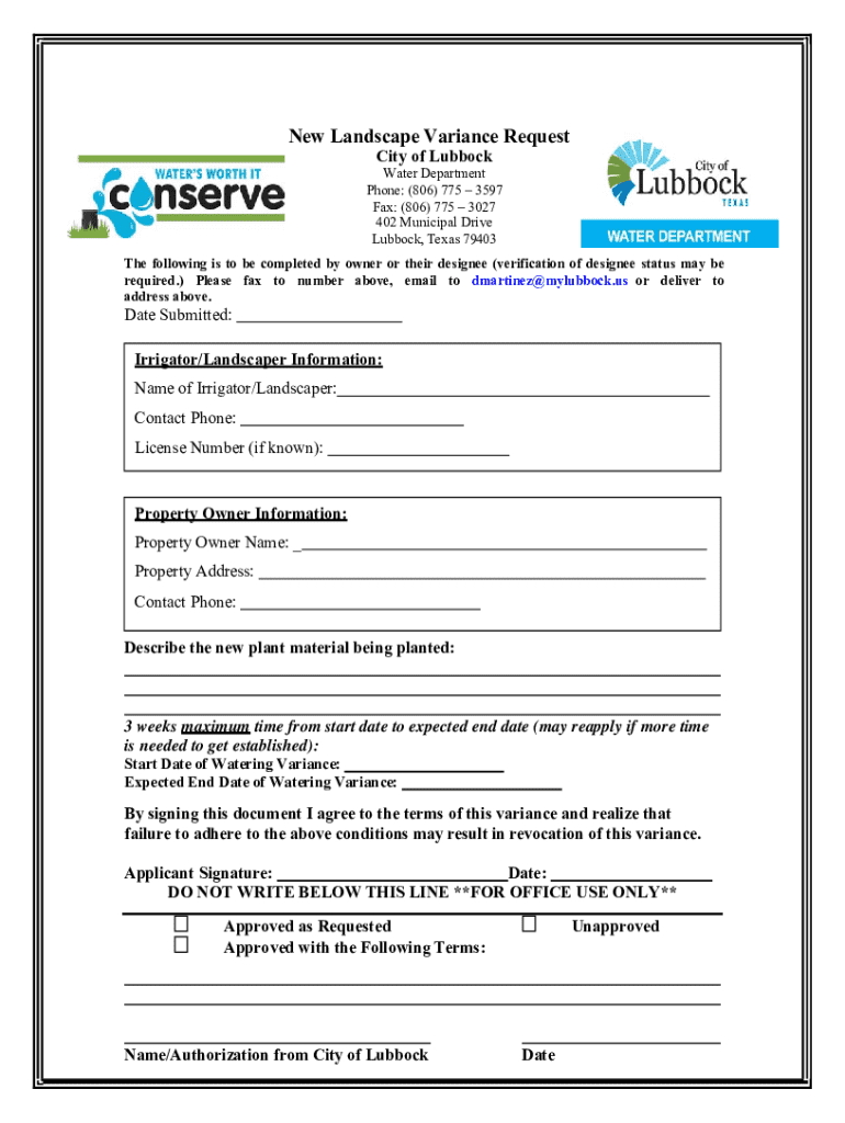 New Landscape Variance Request City of LubbockWater Department Phone: (806) 775 3597 Fax: (806) 775 3027 402 Municipal Drive Lubbock, Texas 79403 The following is to be completed by owner or their