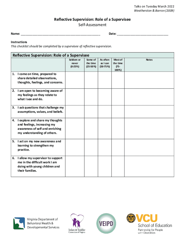 Talks on Tuesday March 2022 Weatherston & Barron (2009)Reflective Supervision: Role of a Supervisee SelfAssessment Name: ___Date: ___Instructions This checklist should be completed by a supervisee