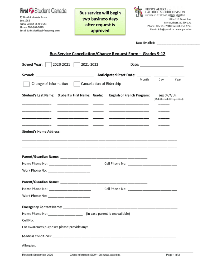 Request cancellation or changes for bus service for Grades 9-12 for the school years 2020-2021 and 2021-2022. Submit your details for processing.