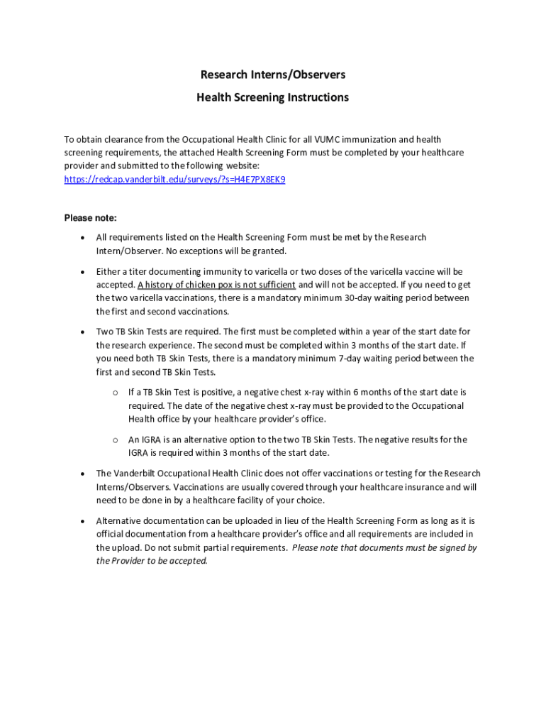 Find essential health screening requirements for Research Interns and Observers at VUMC. Ensure compliance for immunization and health screening forms.