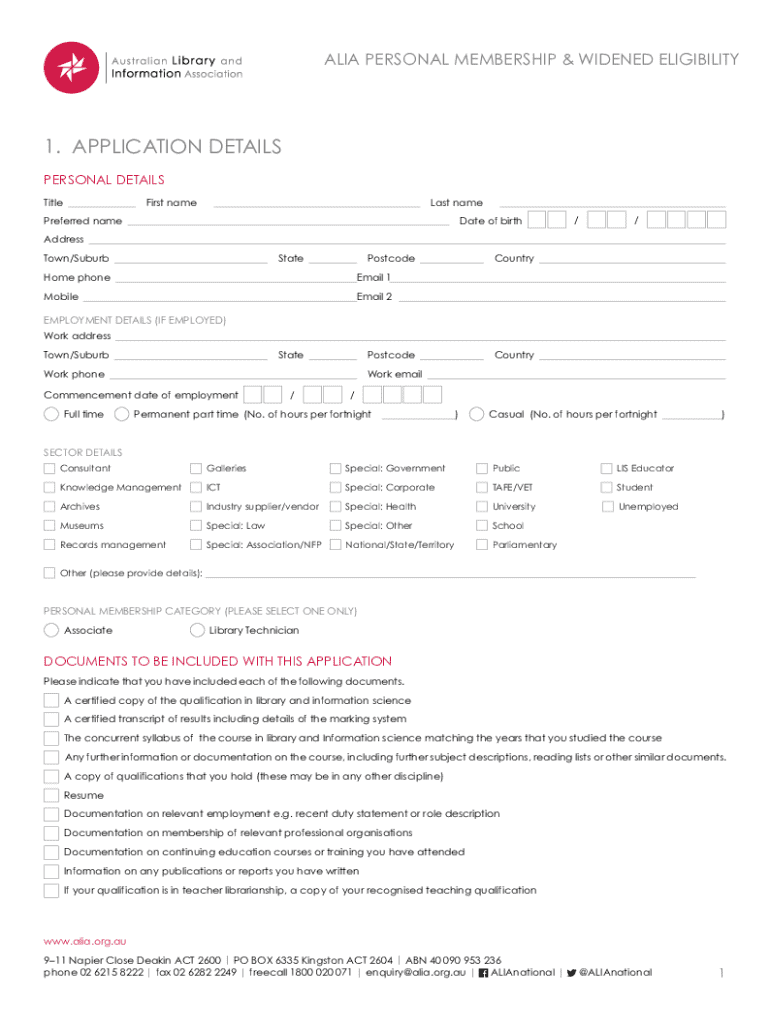 Apply for personal membership with ALIA, providing necessary documentation, employment details, and payment information for 2023 eligibility.