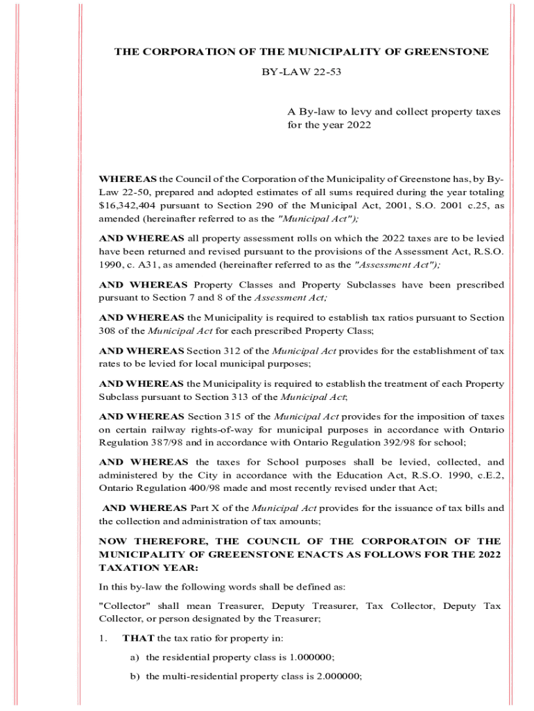 This document outlines the property tax rates and levies for the Municipality of Greenstone for the year 2022, establishing the required tax ratios and payment schedule.